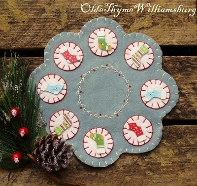 Title (ebay affiliate link): Primitive Stitchery CHRISTMAS Stockings Penny Rug ~Bittersweet Winter Candle Mat
