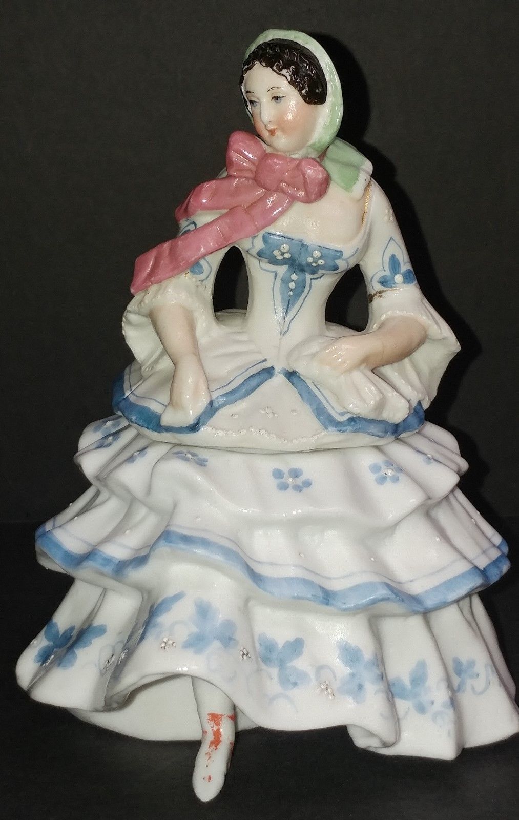 Antique Victorian Porcelain Trinket Box of "Young Lady Running in Dress"