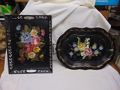 PAIR VINTAGE FINE ARTS STUDIO HAND PAINTED FLORAL BLACK TRAYS
