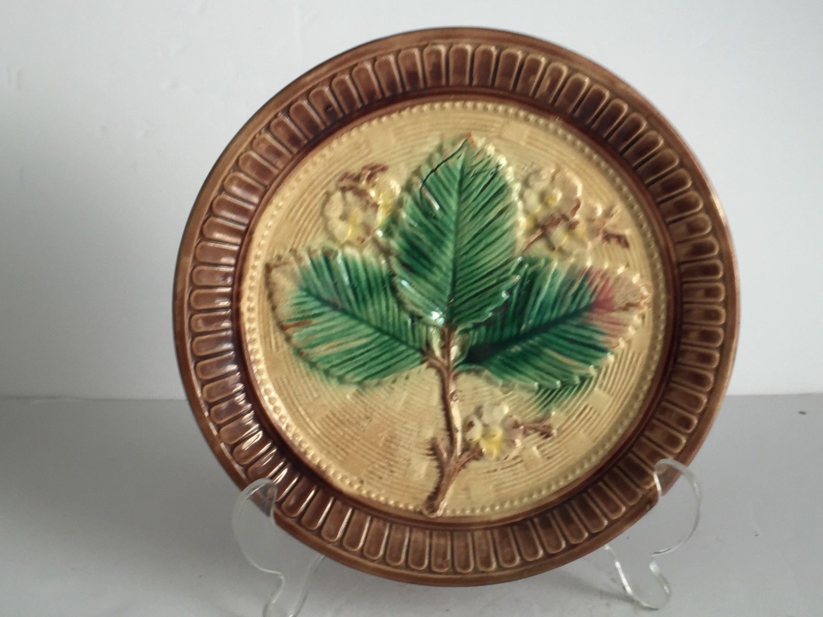Title (ebay affiliate link): Antique Majolica Art Pottery Plate FLORAL AND THREE LEAF c1880s 8" #2 of 3