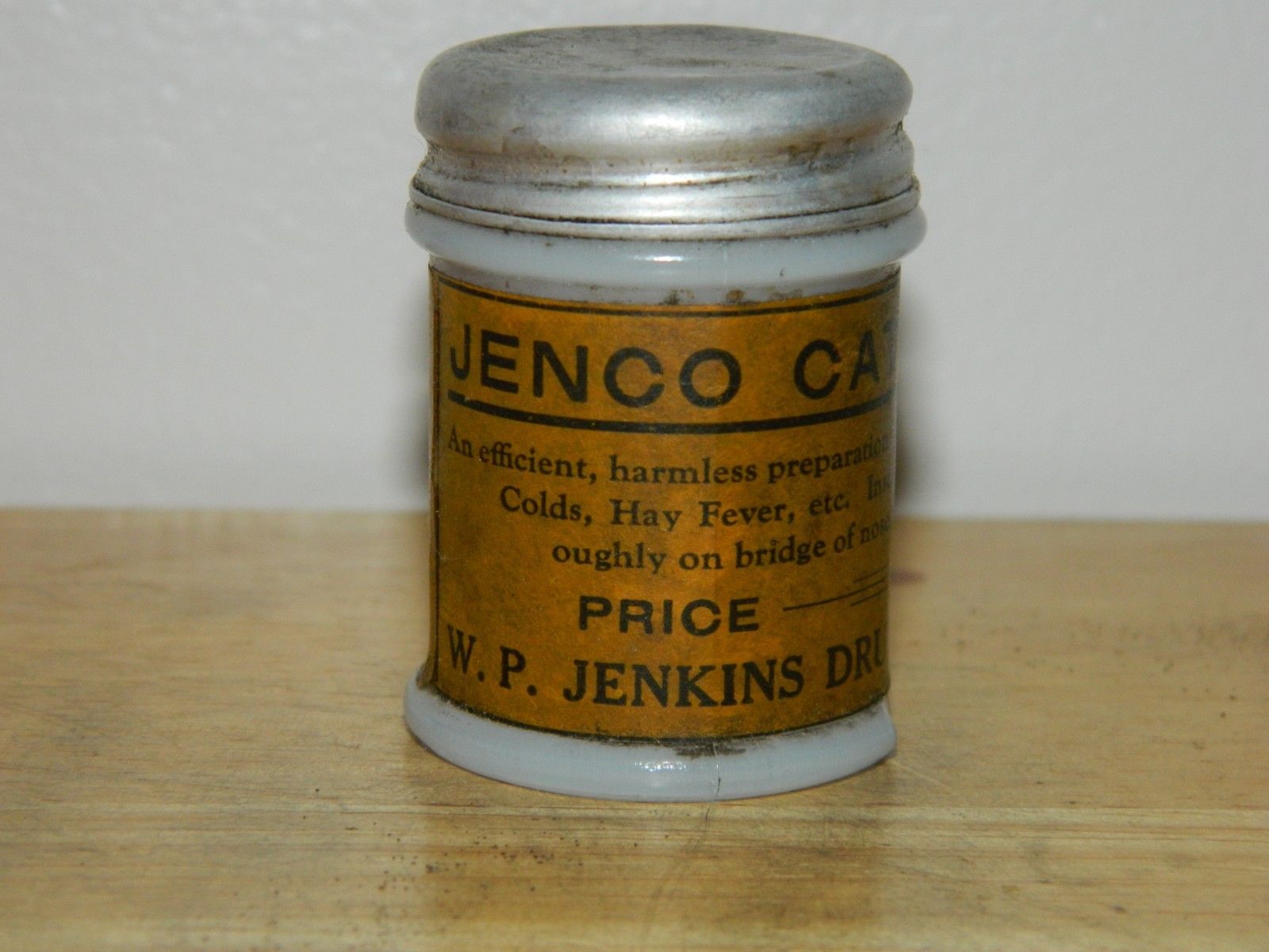 Title (ebay affiliate link): Vtg Apothecary Pharmacy Advertising Glass Jar WP Jenco Catarrh Remedy Dayton OH