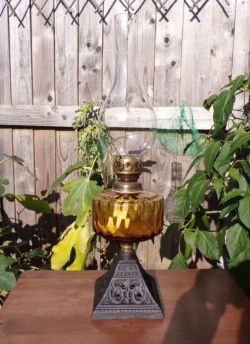 Title (ebay affiliate link): Victorian oil lamp Amber glass font cast iron base single burner working order