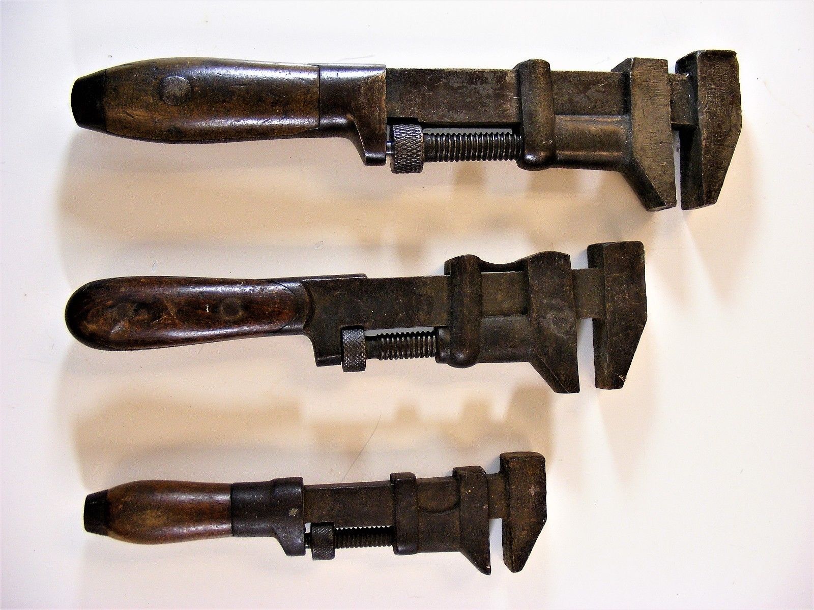 Title (ebay affiliate link): Lot of three different size antique pipe wrenches. Wood handles.