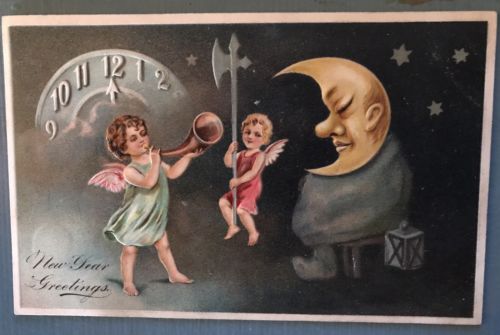 Title (ebay affiliate link): Angels with Moon & Clock Antique Embossed PFB New Year Postcard-k603