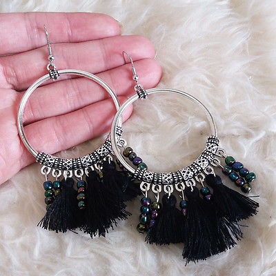 Title (ebay affiliate link): Vintage Womens Bohemian Hippies Heavy Antique Ring Black Tassels Hook Earrings