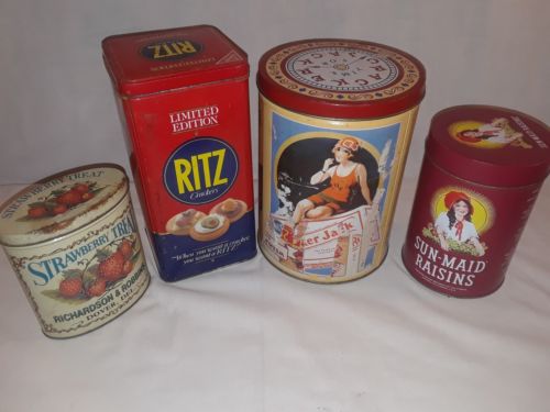 Title (ebay affiliate link): Lot of Vintage Tins; Ritz, Cracker Jack, Sun Maid Raisins, Strawberry Treat