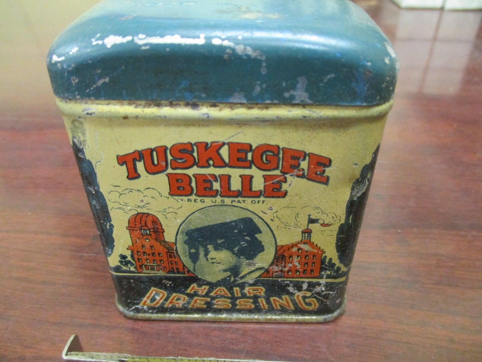 Title (ebay affiliate link): 1920s Advertising Hair Dressing Tin Tuskegee Belle Black Americana College