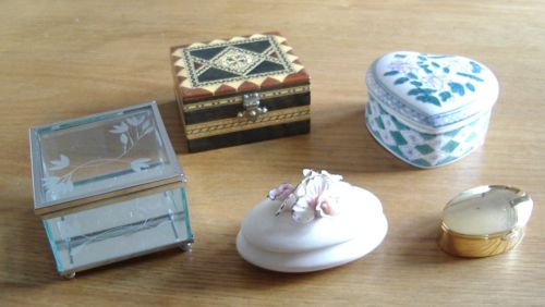 Title (ebay affiliate link): 4 ASSORTED TRINKET BOXES & A PILL BOX ---CAPODIMONTE, GLASS, WOOD, POTTERY ETC.