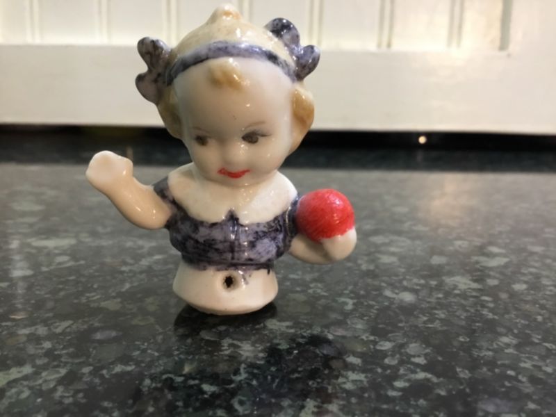 Title (ebay affiliate link): VINTAGE ANTIQUE PORCELAIN HALF DOLL PIN CUSHION Little Girl holding ball