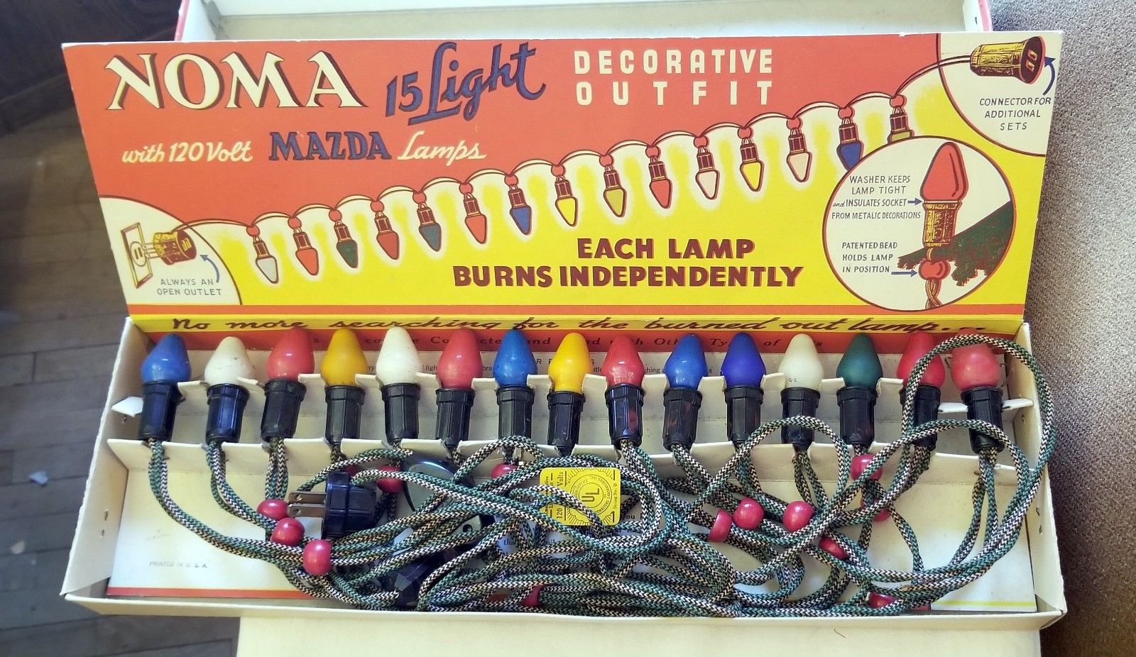 Title (ebay affiliate link): First Boxed Set of C-7 1/2 Christmas Tree Lights. Works. 15 Lamps. MAZDA USA