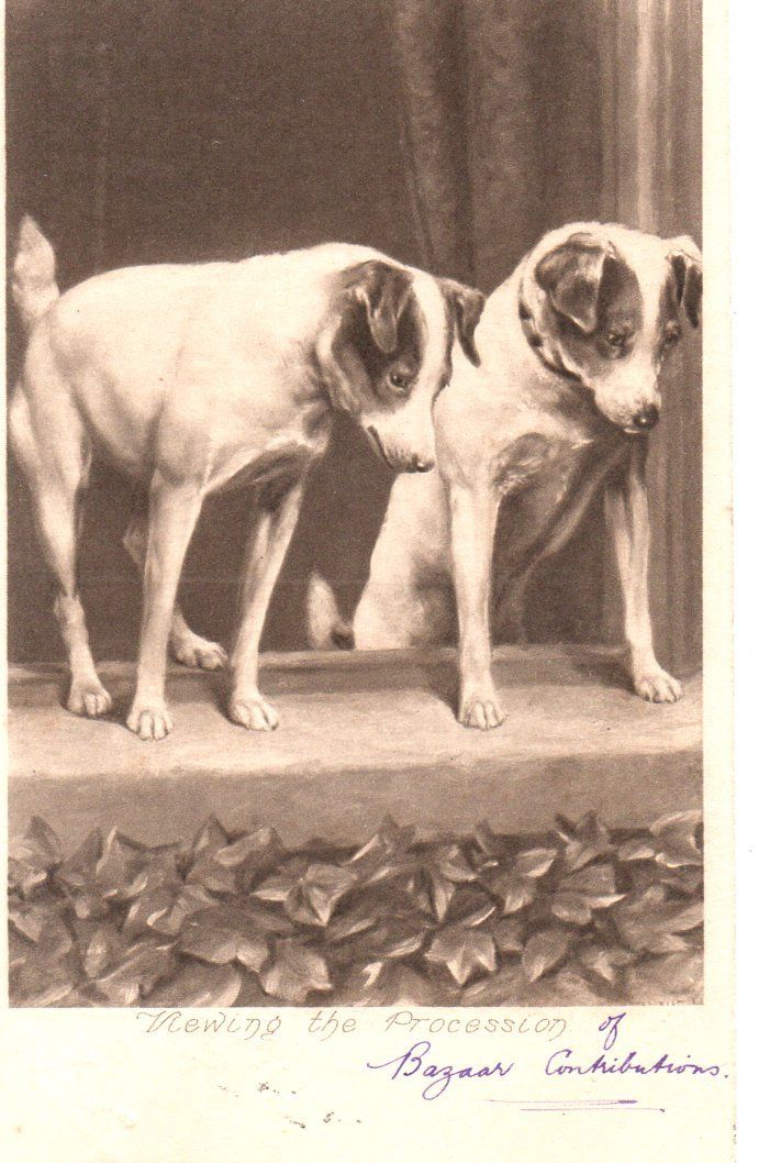 VINTAGE ART postcard: TERRIER DOGS ON A WINDOWSILL surname ROSCOE Stockport 1903