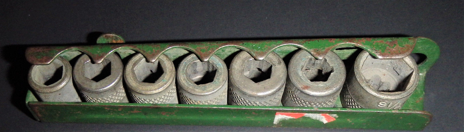 Old Vintage 1/4" Drive Indestro, 7 Socket Set, Green Painted Metal Case 4.25"L