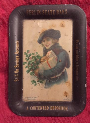 Vintage Berlin State Bank Serving Tray Tin Sign American Art Works Holiday Holly