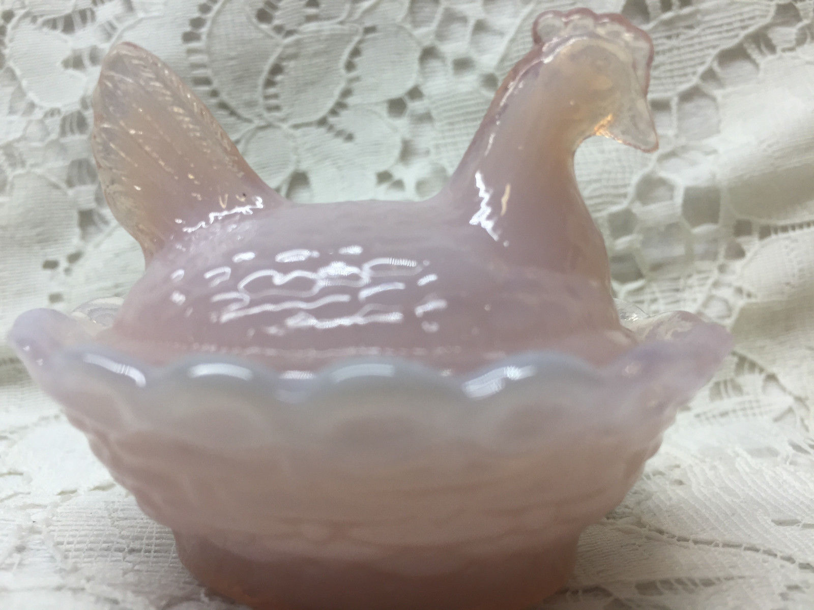Pink milk glass salt celt hen chicken on nest basket dish rooster / crown tuscan