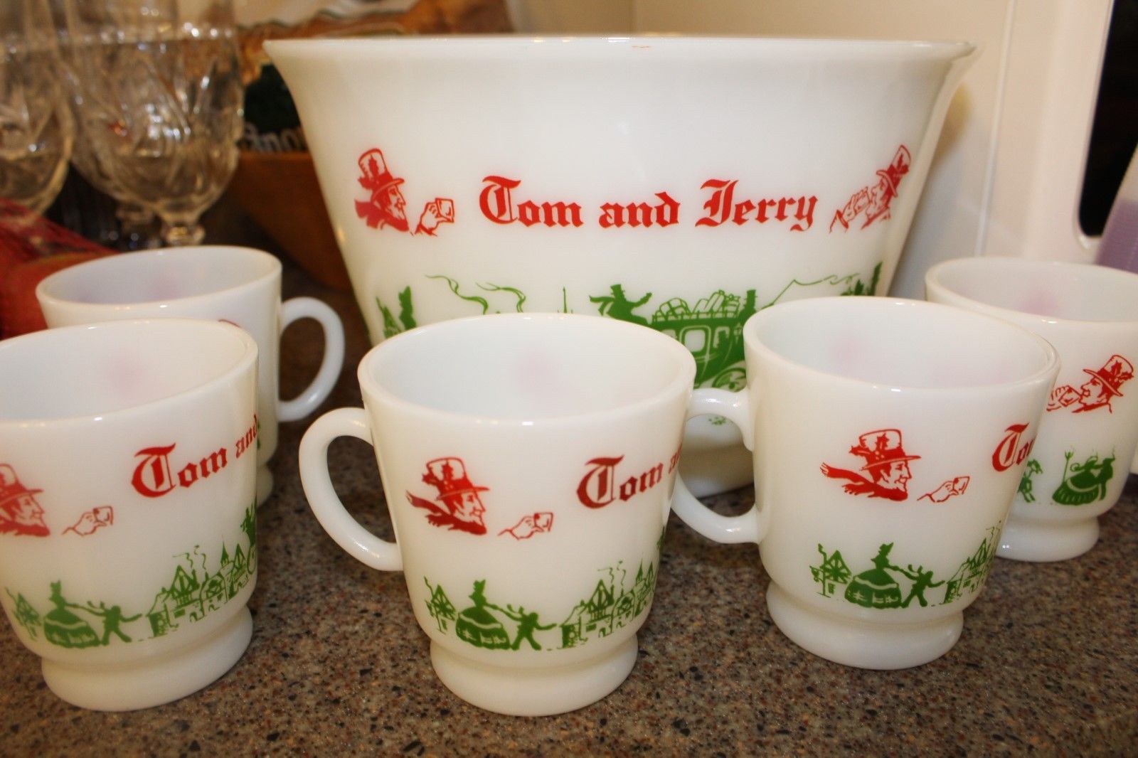 Vintage Hazel Atlas Tom and Jerry Milk Glass Eggnog 6PC Punch Bowl Set Christmas