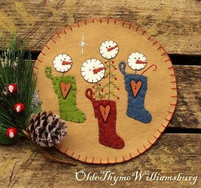 Title (ebay affiliate link): Primitive Stitchery CHRISTMAS Snowman Stockings Penny Rug ~ Winter Candle Mat