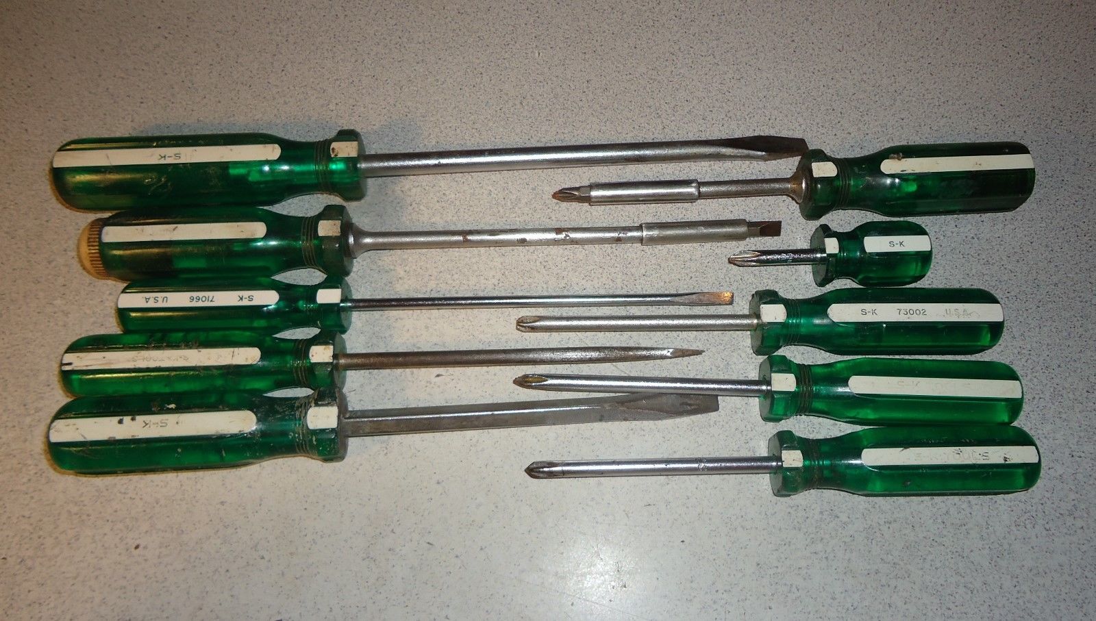 Title (ebay affiliate link): Vintage SK Tools 10 pc. Green/White Phillips/Slotted Screwdriver Set 2 Magnetic