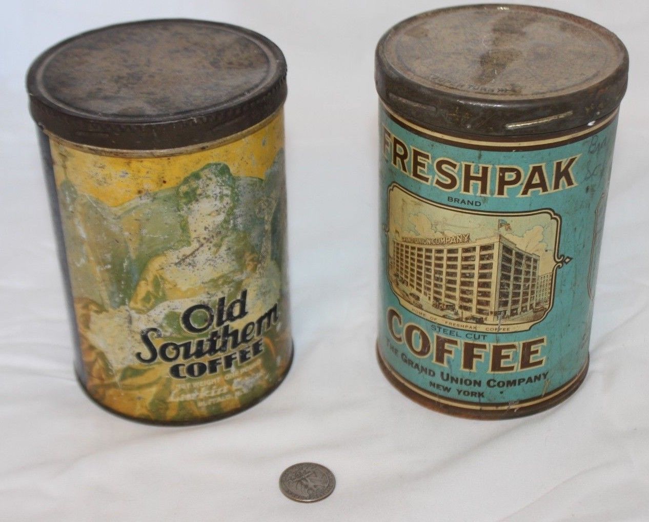 (2) Antique Vintage Coffee Tins NEW YORK Freshpak Blue Old Southern 6-7" Tall
