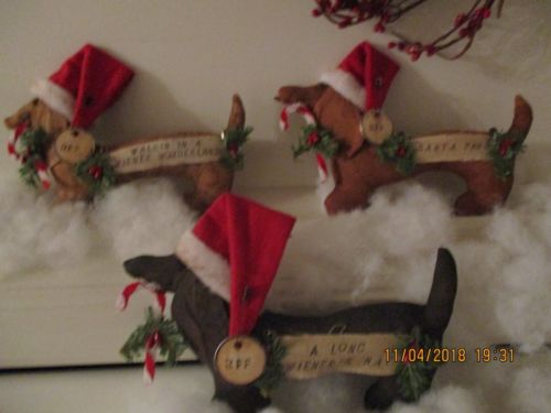 Title (ebay affiliate link): PriMiTivE CHRisTMAs DacHSHUndS~3 ornIES~~WreATh~SanTA Hat~WALKIN'' IN WIENERLAND