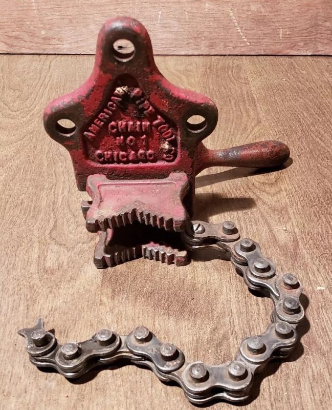 Title (ebay affiliate link): Vintage American Pipe Tool Co. Chain Vice No. 1 Chicago for Parts or Repair