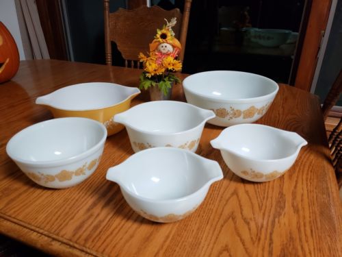 Vintage 6 Pc. Pyrex Gold Pattern / White Milkglass