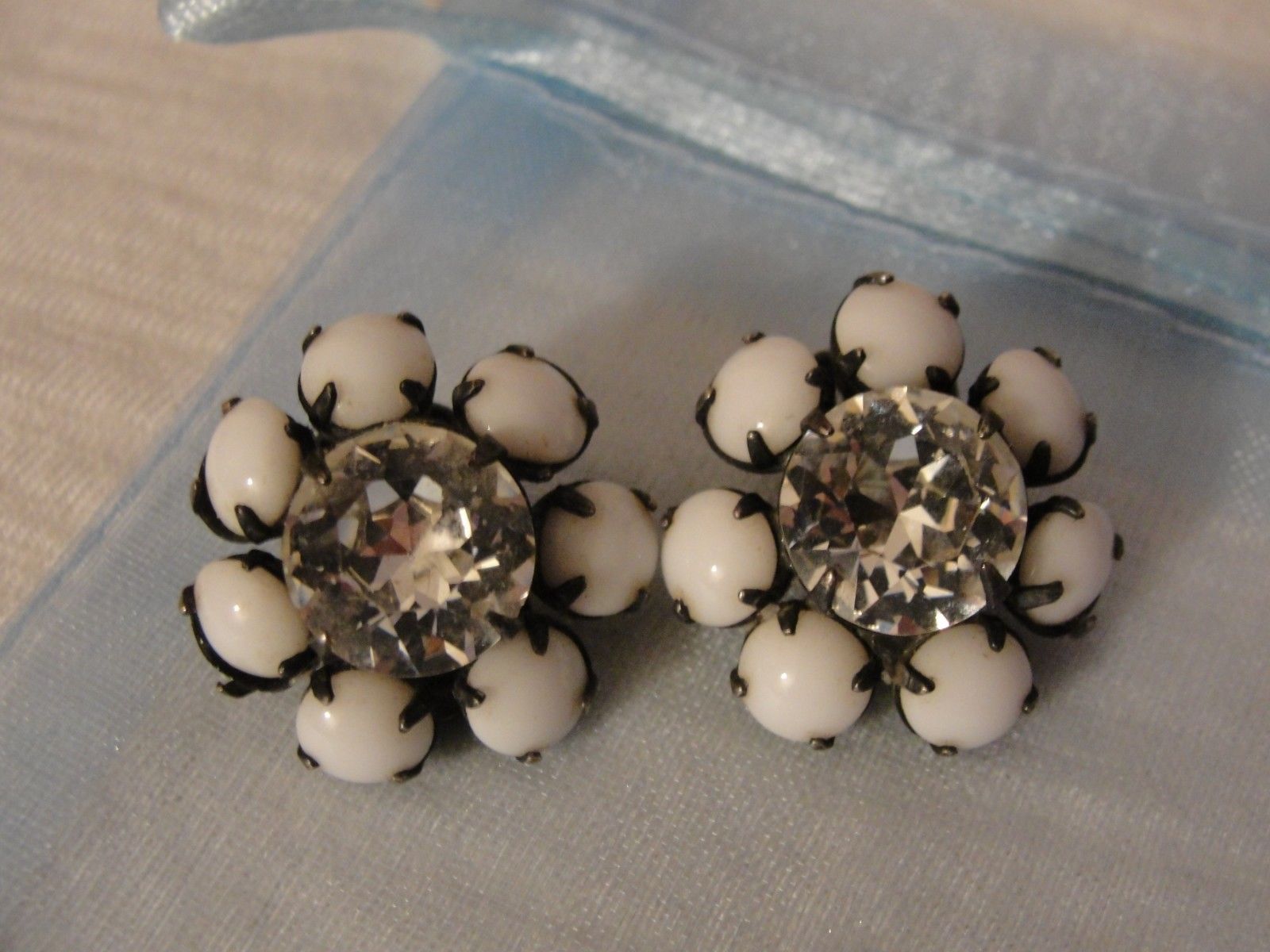 Title (ebay affiliate link): VINTAGE MILK GLASS AND CLEAR RHINESTONE FLOWERS CLIP ON EARRINGS SO PRETTY!