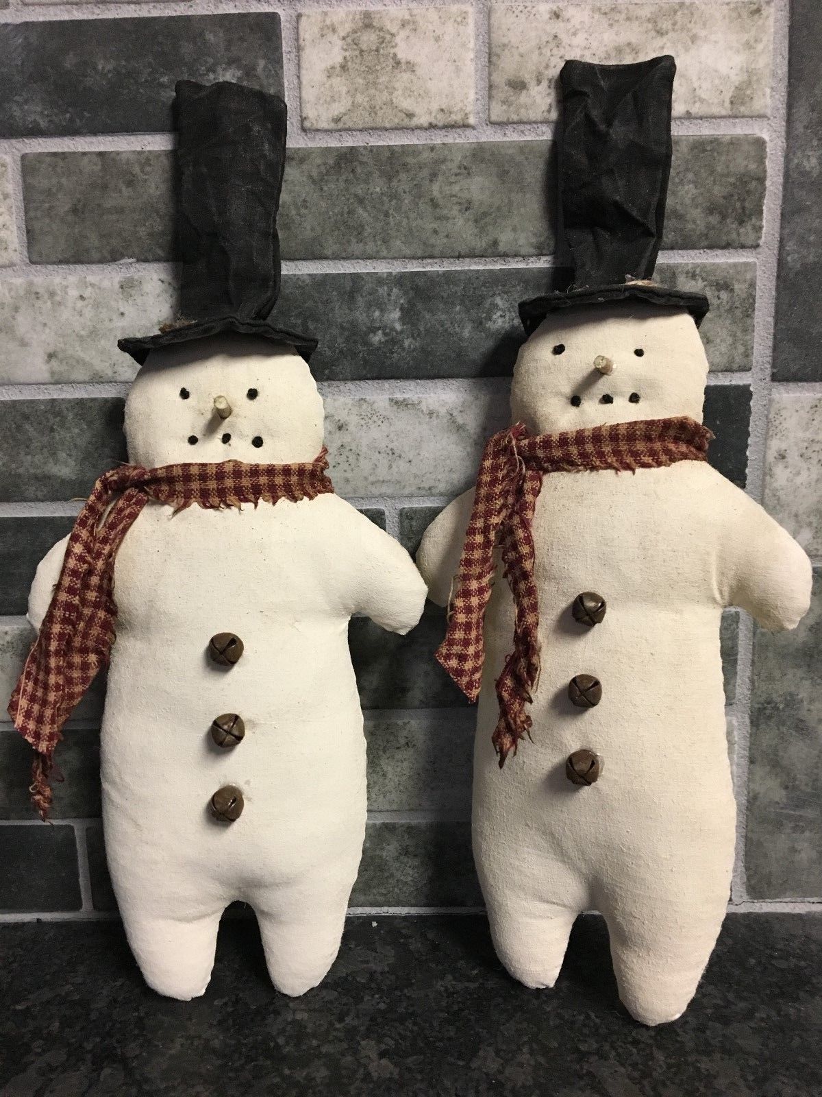 Title (ebay affiliate link): Primitive grungy handmade Christmas snowmen set of 2 tucks ornie doll