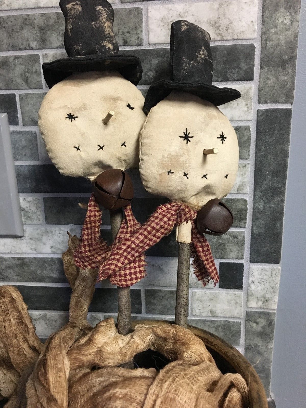 Title (ebay affiliate link): Primitive grungy handmade Christmas snowmen set of 2 poke tucks ornie doll