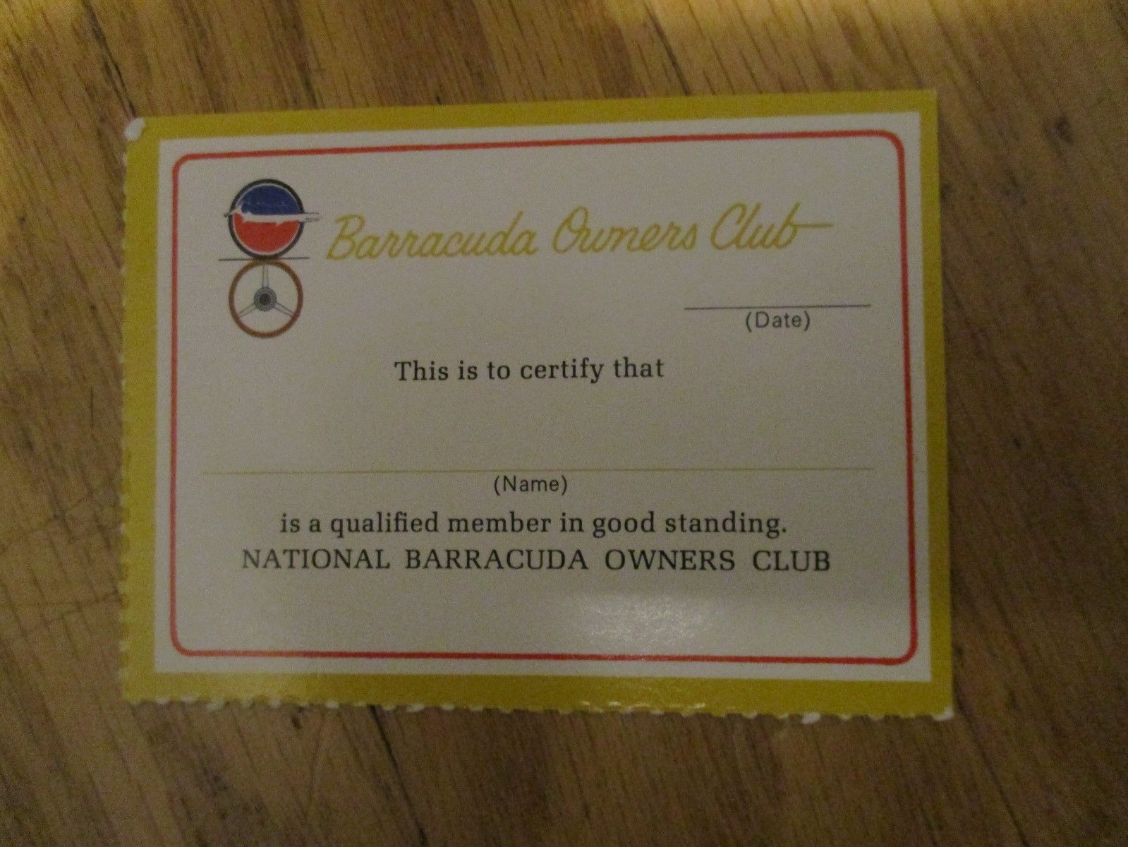 1966 BARRACUDA OWNERS CLUB MEMBERSHP CARD WITH NO NAME WRITTEN IN