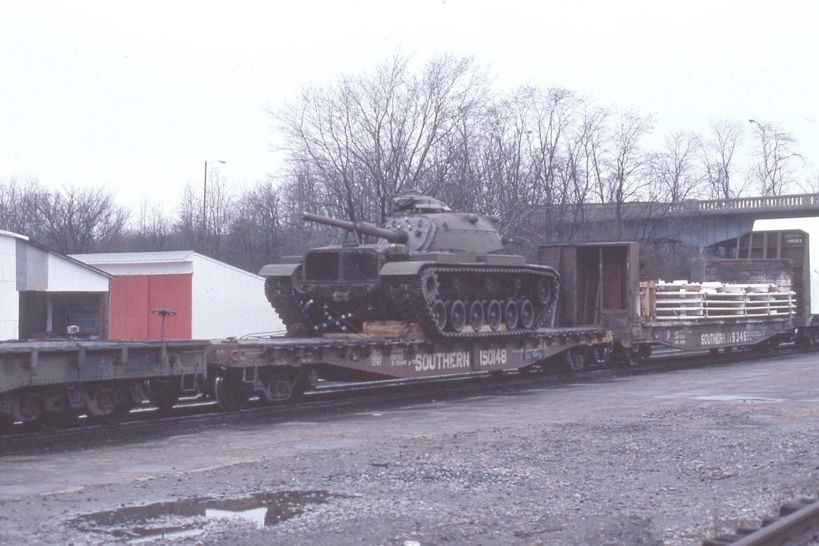 Title (ebay affiliate link): ORIGINAL KODACHROME SOUTHERN ACTION ARMY TANK FLAT CAR # 150148 DANVILLE 1977