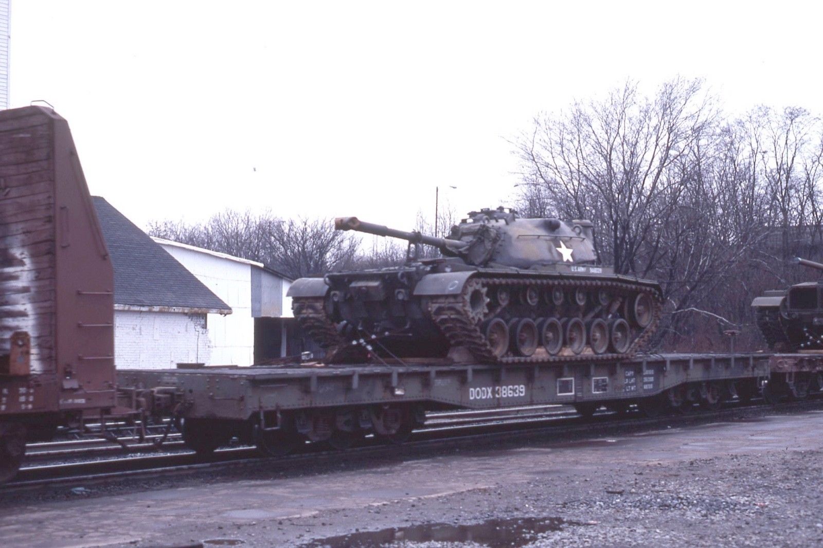 Title (ebay affiliate link): ORIGINAL KODACHROME SOUTHERN ACTION ARMY TANK FLAT CAR # 38639 DANVILLE 1977