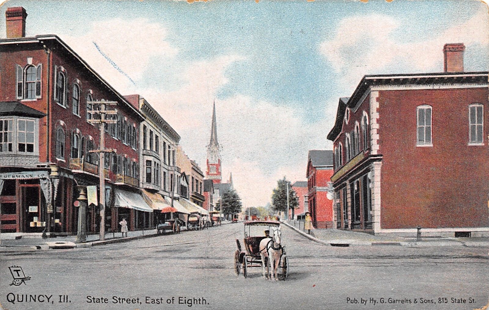 Title (ebay affiliate link): Quincy Illinois~State Street E @ Eighth~Germann Co~White Horse Buggy~1907 TUCK