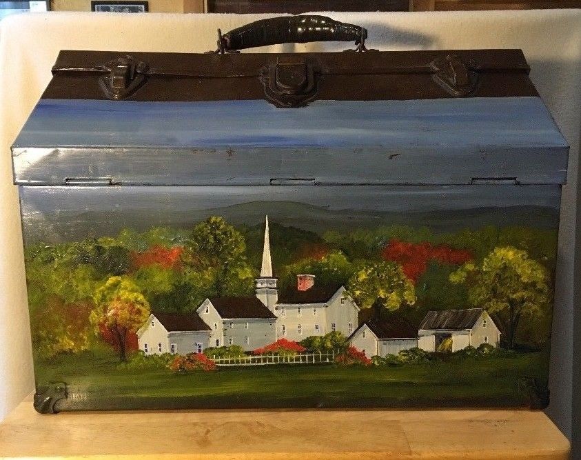 Title (ebay affiliate link): ANTIQUE Country PRIMITIVE Hand Painted signed Metal Tool Box, New England Scene