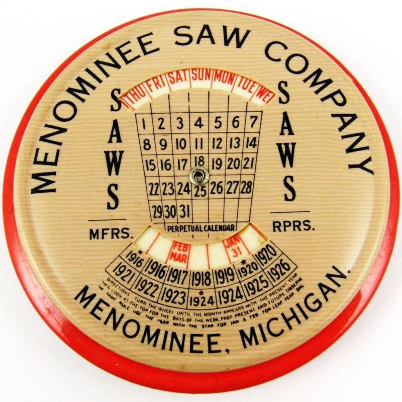 Title (ebay affiliate link): VINTAGE MENOMINEE SAW COMPANY MICHIGAN CELLULOID CALENDAR PAPERWEIGHT MIRROR