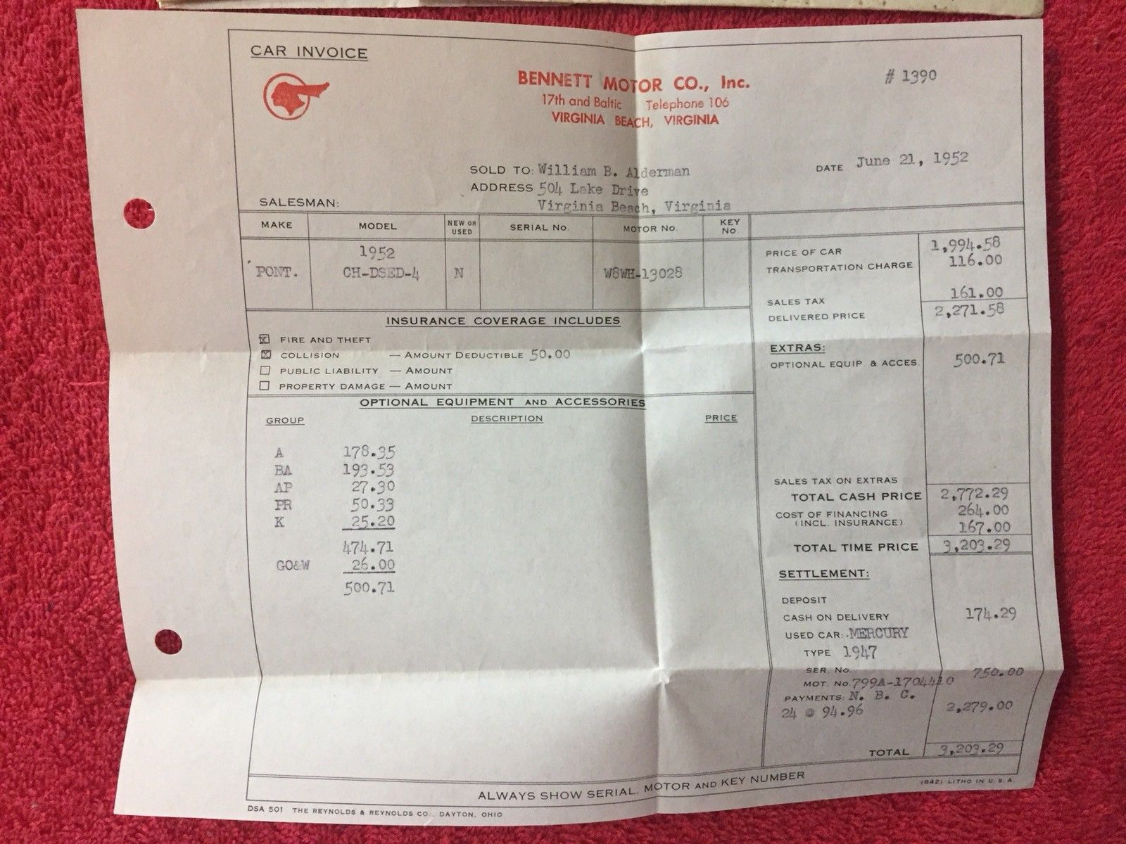 Title (ebay affiliate link): 1952 Pontiac Chieftain, New Car Invoice W/ Logo - Bennett Motor Co... Virginia