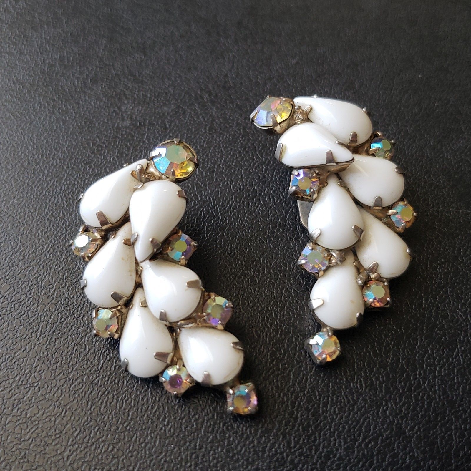 Title (ebay affiliate link): Unsigned WEISS Vintage Clip Earrings White Pear Milk Glass AB Crystal H107