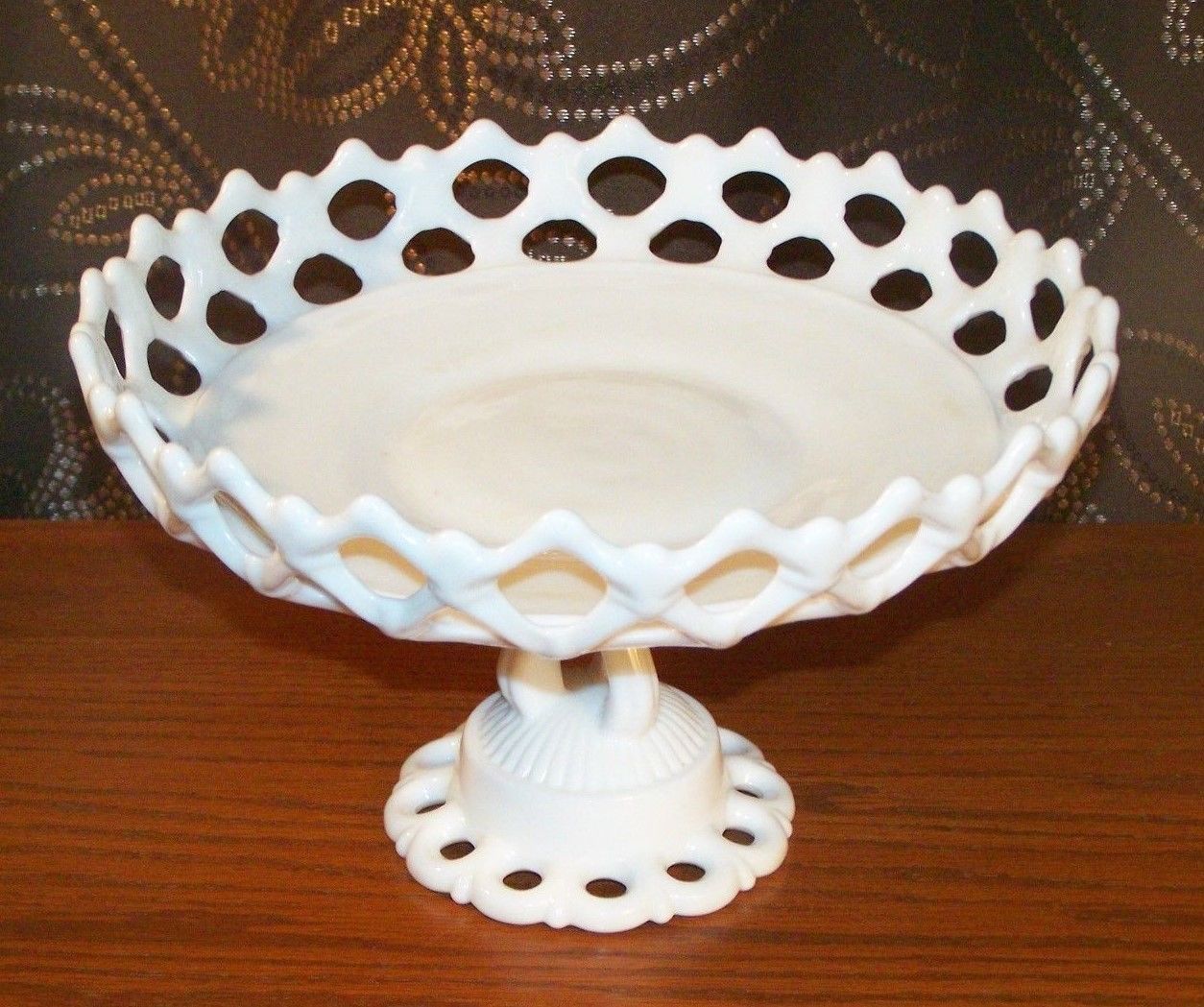 Title (ebay affiliate link): VINTAGE WESTMORELAND WHITE MILK GLASS DORIC OPEN LACE CENTERPIECE CONSOLE BOWL