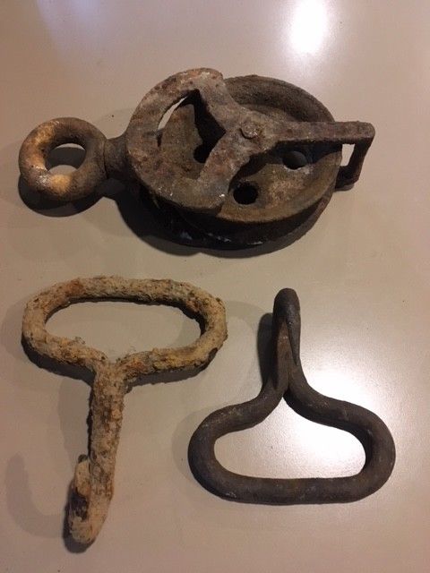 Antique Barn Pulley Heavy Duty & 2 Farm Bale, Meat, Ice Hooks Rustic Vintage