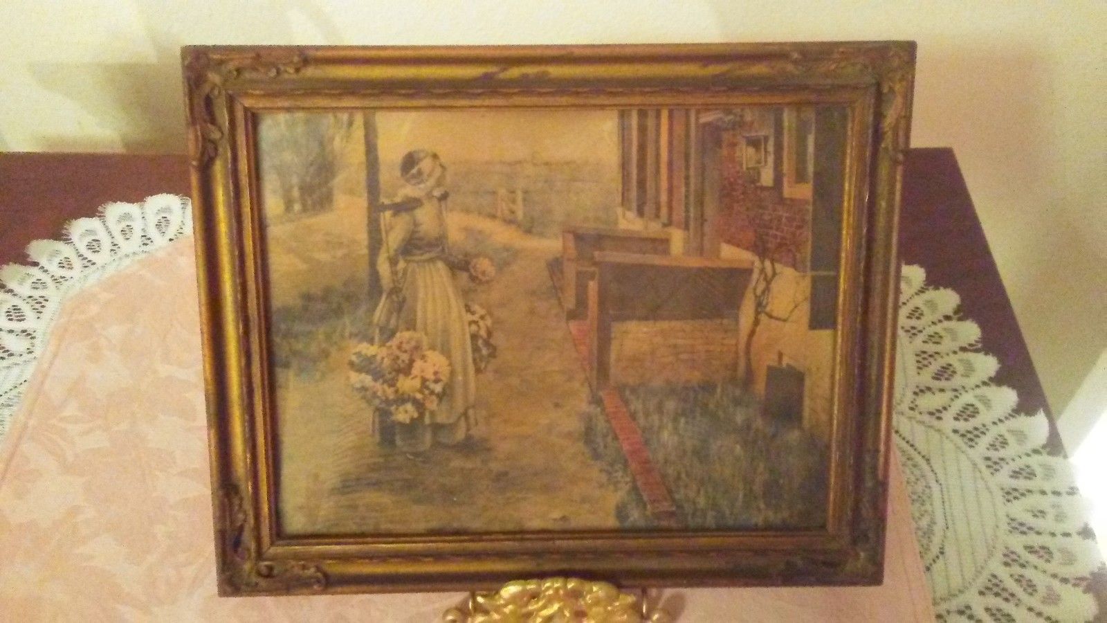 Title (ebay affiliate link): Antique Print Of Lady Carrying Flowers In A Beautiful Carved 8 X 20 Frame
