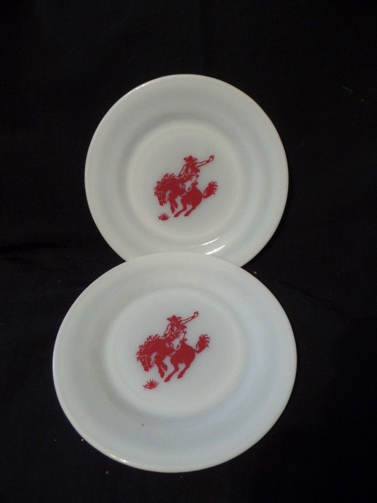 Pair of Vintage Hazel Atlas Milk Glass 7" Plate - Red Cowboy - 1950s - NICE! (B)