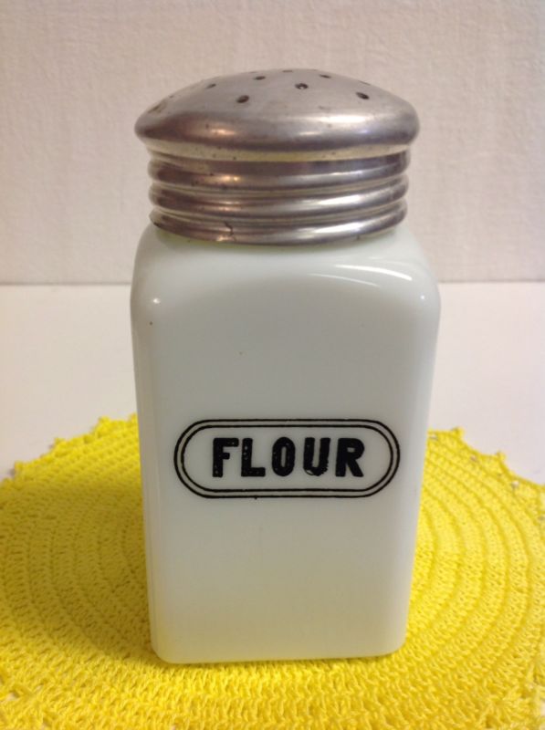VINTAGE MILK GLASS "FLOUR" SHAKER STRONG LABEL COLORING