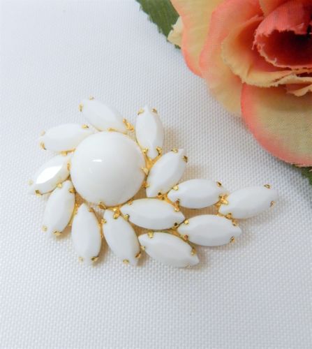 Title (ebay affiliate link): VINTAGE JULIANA D&E GOLD TONE MILK GLASS RHINESTONE WHITE RESIN CABOCHON BROOCH
