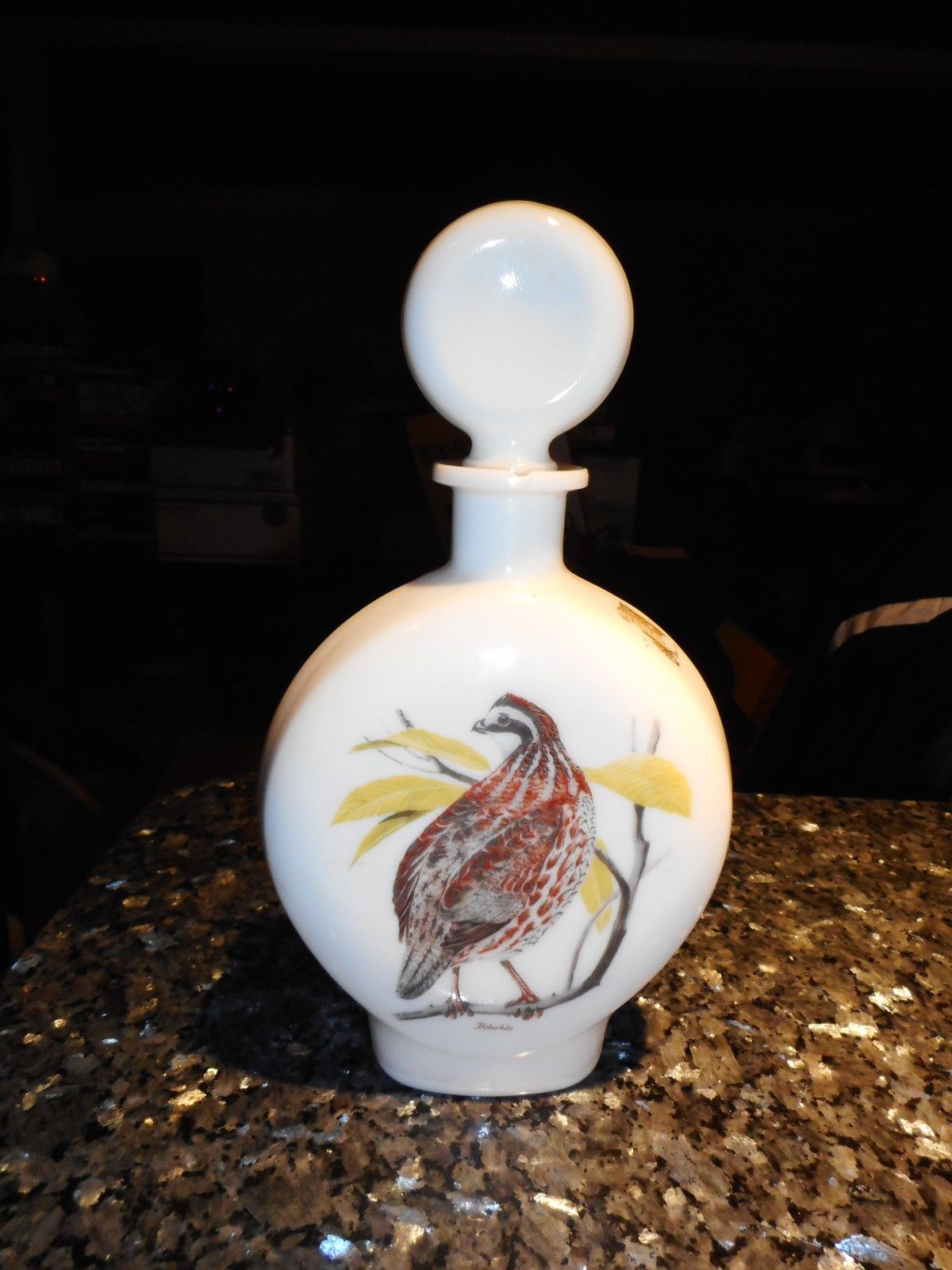 Title (ebay affiliate link): Vintage 1969 Canada Whiskey Field Birds Bobwhite Milk Glass Decanter