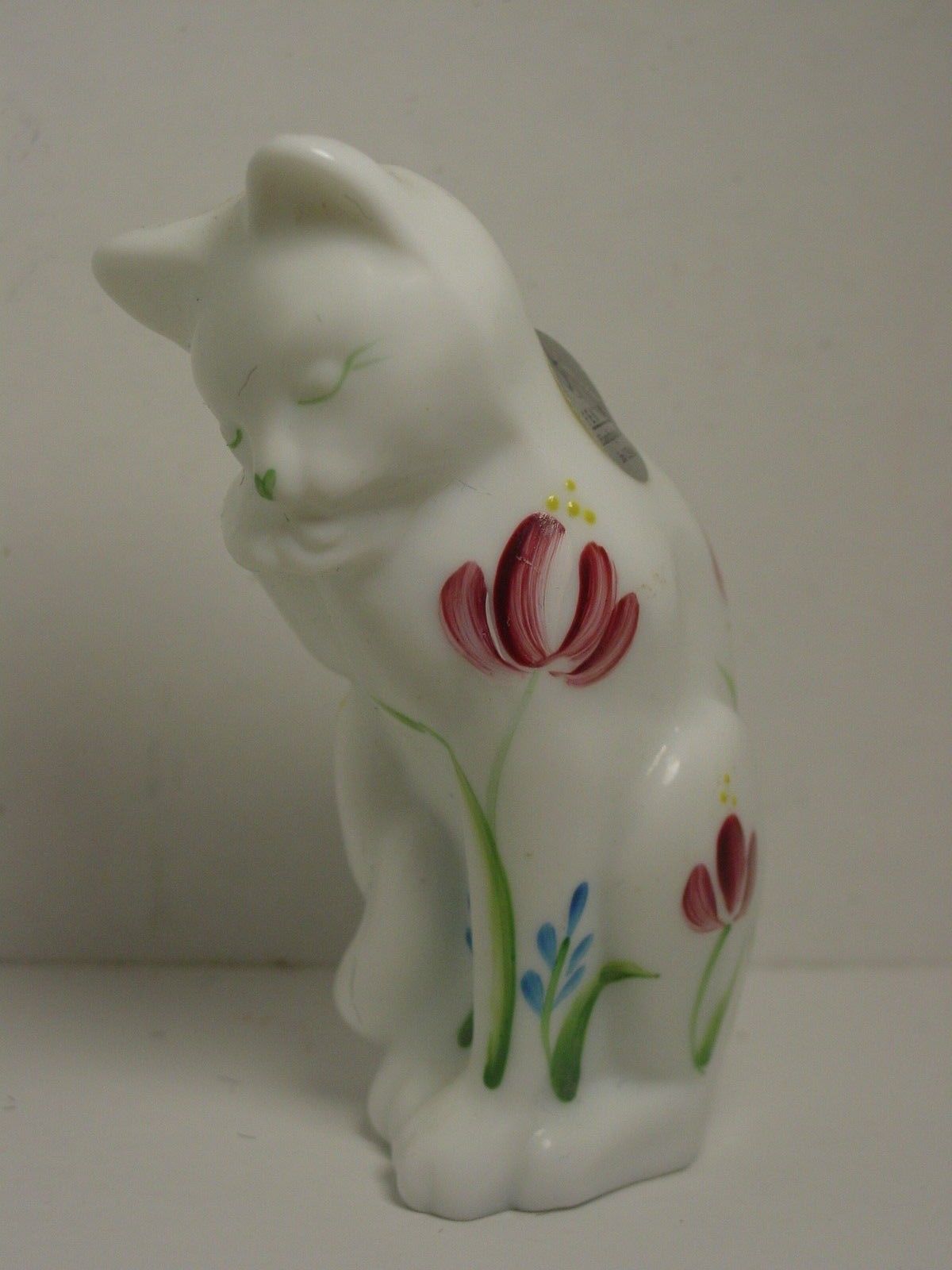 Title (ebay affiliate link): White Milkglass - FENTON - Grooming Cat - Original Sticker - Excellent Condition