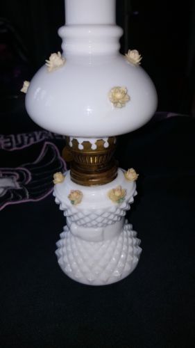 MILK GLASS MINI OIL LAMP WITH MINI ROSES VERY PRETTY