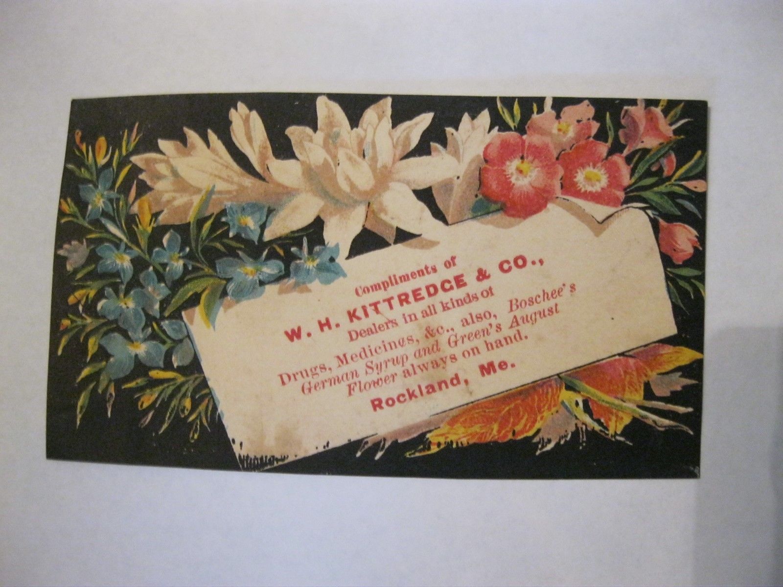 Victorian Trade Card 1800''s W.H. Kittredce Rockland ME Lily Bouquet August 56