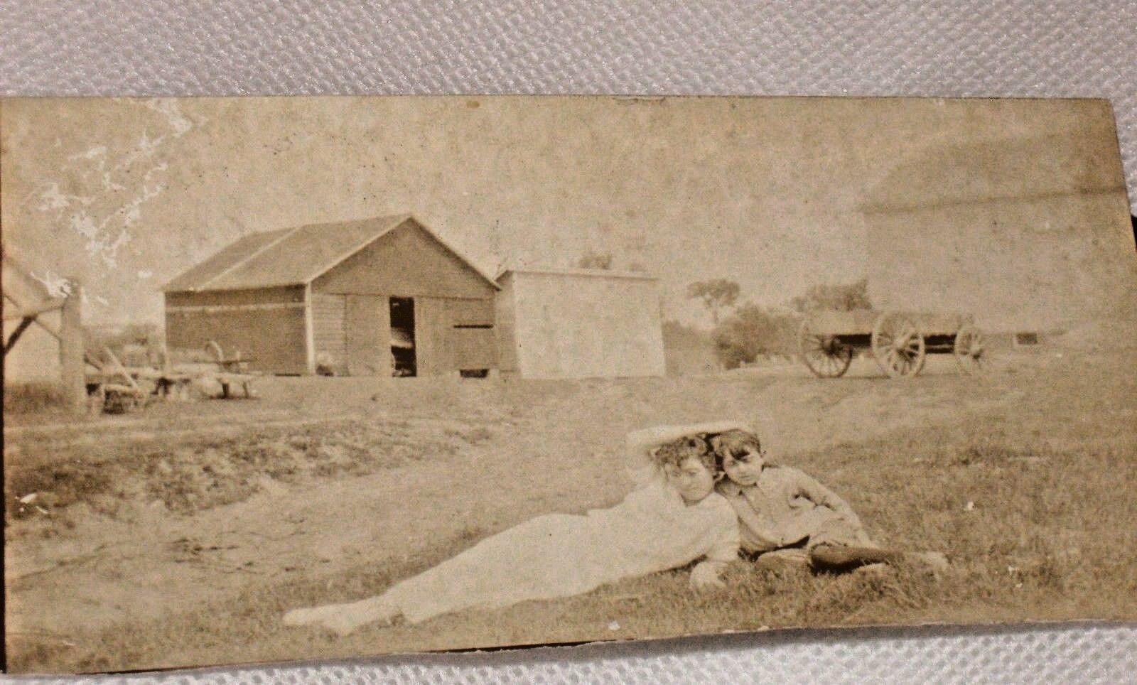 Vtg. Antique Photo Mother & Son Sleeping/Resting On Ground On Farm W/Wagon, Barn
