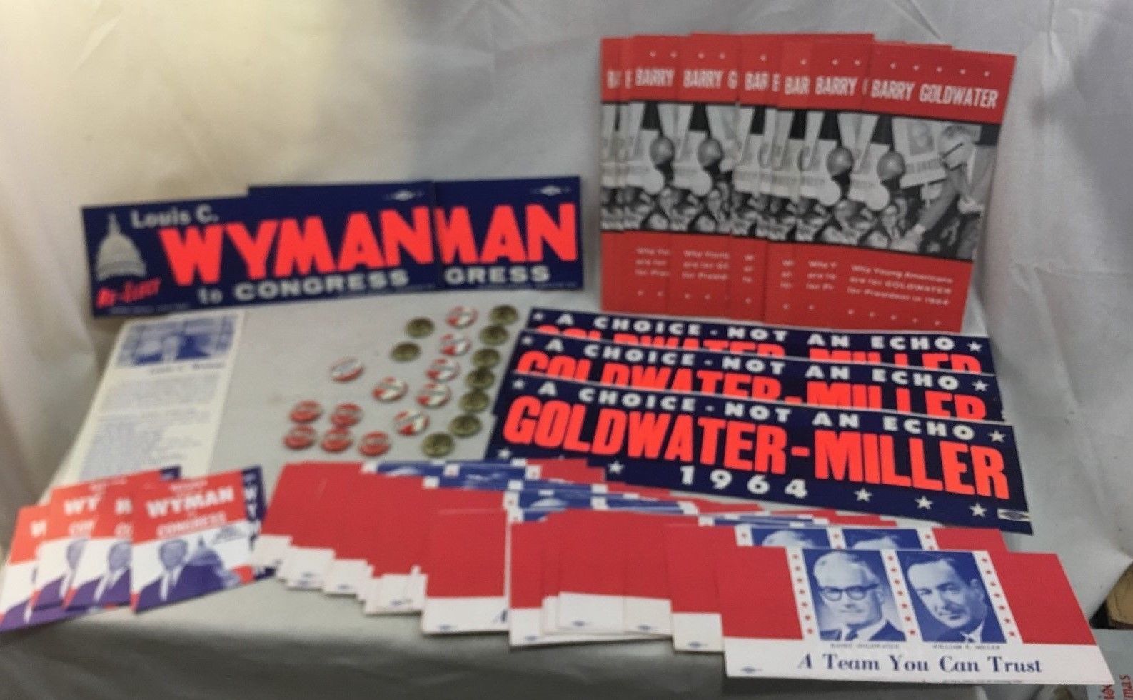 Title (ebay affiliate link): Lot Orig. 1964 Goldwater / Miller Wyman Pillsbury Bumper Stickers Pins Pamphlets
