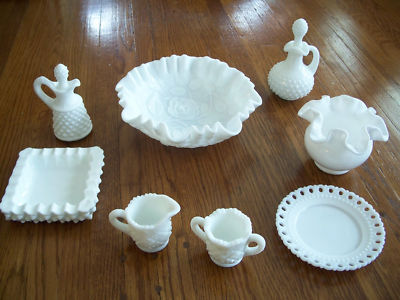Lot of 8 White Milk Glass Bowl-Cruets-Plate-Vase-
