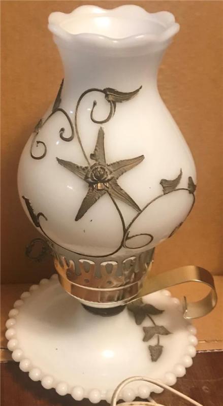 Title (ebay affiliate link): Vintage White Milk Glass with Metal Floral Design 10 3/4" T Electric Table Lamp